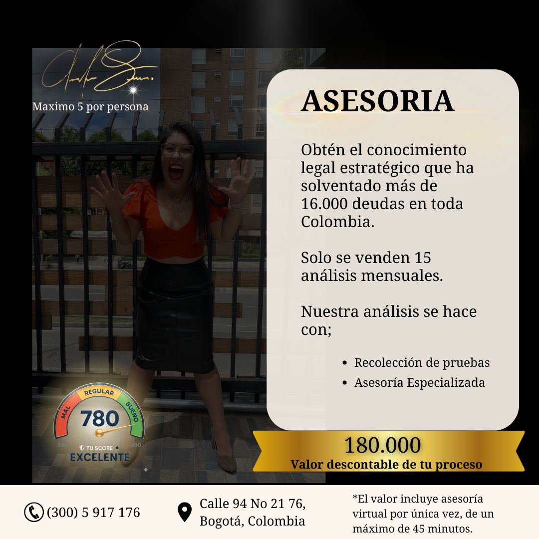 Esta asesoría es un servicio VIP de Andrea García Abogada S.A.S. diseñado para clientes que buscan una solución estratégica, profesional y legalmente fundamentada para sus deudas y reportes negativos. Es un proceso estructurado en tres fases que te da el mapa legal completo.