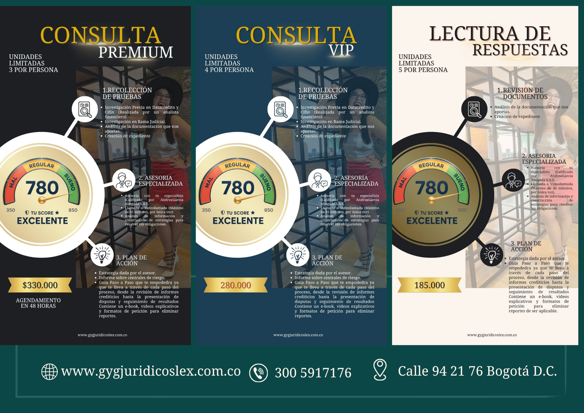 Lectura de respuestas: servicio exclusivo para clientes que previamente han comprado formatos en sus distintas modalidades, y una obtienen respuesta requieren de un acompañamiento para el análisis de las mismas con el fin de tener una orientación más clara sobre como continuar su proceso que inicio de forma autónoma. No contiene consulta de centrales de riesgo, ni informe financiero al entenderse que el cliente entrega la información de caso ya recolectada y se agenda según disponibilidad promedio de 7 días